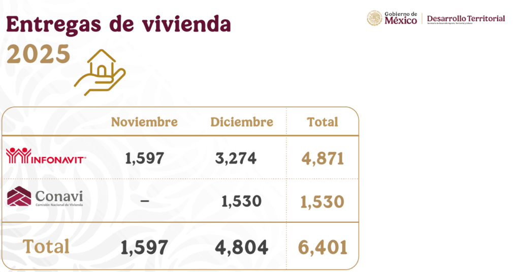 El Gobierno de México, a través de la Secretaría de Desarrollo Agrario, Territorial y Urbano (Sedatu), informó que como parte del programa Vivienda para el Bienestar entre noviembre y diciembre de este año se entregarán 6 mil 401 viviendas terminadas: 4 mil 871 del Instituto del Fondo Nacional de la Vivienda para los Trabajadores (Infonavit) y mil 530 de la Comisión Nacional de Vivienda (Conavi).