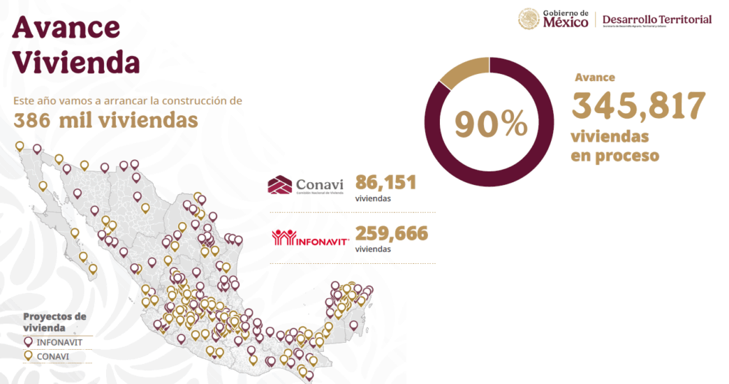 La secretaria de Desarrollo Agrario, Territorial y Urbano, Edna Elena Vega Rangel, detalló que al momento se tienen 345 mil 817 viviendas en proceso, lo que representa un avance del 90 por ciento de la meta de este año de 386 mil: 256 mil 666 del Infonavit y 86 mil 152 de la Conavi. Agregó que, también, ya se han regularizado 222 mil 197 escrituras, respecto a la meta sexenal de un millón.