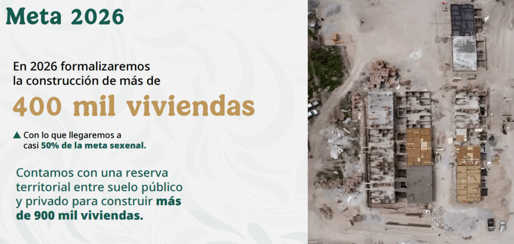 La titular de la SEDATU señaló que para 2026, la meta son 400 mil viviendas “con lo que llegaremos prácticamente al 50% de la meta sexenal. Ya hay la reserva territorial necesaria para para lograrlo en realidad hoy ya existe esta reserva para construir 900.000 viviendas.