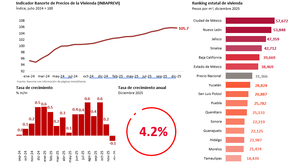 Durante diciembre, el precio de la vivienda a nivel nacional registró una variación anual de 4.2%, segun el El Indicador Banorte de Precios de Vivienda (INBAPREVI).