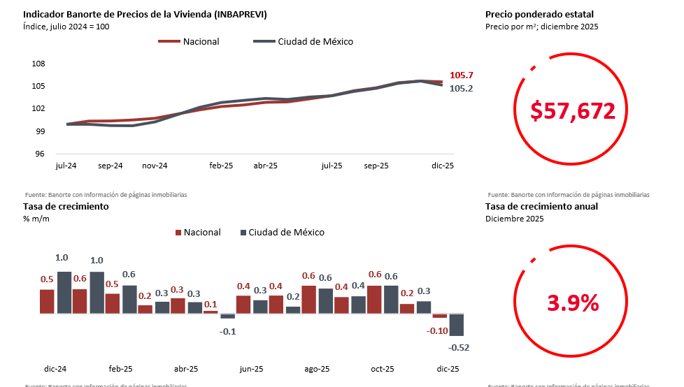 ▪ En diciembre de 2025, el precio de la vivienda en la Ciudad de México mostró un incremento anual de 3.9%, cifra ligeramente inferior al crecimiento nacional (4.2% a/a).