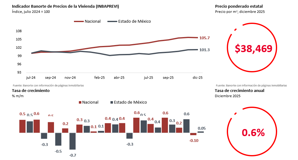 - El precio de la vivienda en el Estado de México registró un crecimiento anual de 0.6% en diciembre de 2025. Sin embargo, dicho aumento fue significativamente inferior al avance de 4.2% nacional.