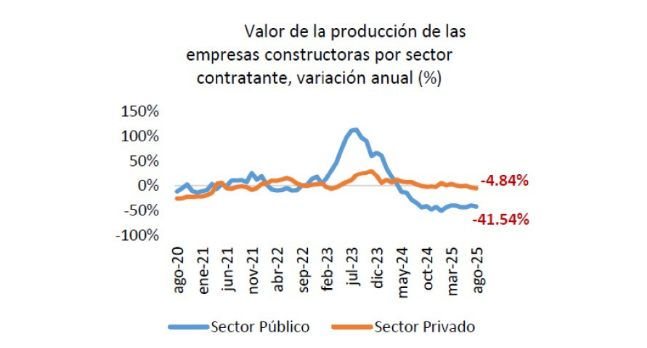 La Encuesta Nacional de Empresas Constructoras (ENEC) correspondiente a agosto del 2025 mostró que el valor total de la producción cayó 2.87 por ciento mensual, sumando dos meses de disminuciones y siendo la mayor contracción desde enero, señalan Gabriela Siller Pagaza, directora de Análisis Económico-Financiero, Jesús A. López Flores, subdirector de Análisis Económico-Financiero y Gerardo Villarreal Morales, analista Económico-Financiero en Grupo Financiero Base.
