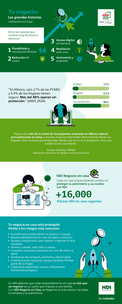 Ante este panorama, HDI Seguros presenta HDI Negocio en Casa, una solución diseñada para proteger los emprendimientos que operan desde el hogar y, al mismo tiempo, salvaguardar el patrimonio familiar. Esta póliza ofrece coberturas que incluyen incendio, robo, responsabilidad civil, daño a cristales, equipo y maquinaria, además de asistencias en cerrajería, plomería y electricidad.