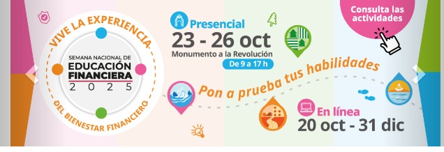 La Semana Nacional de Educación Financiera (SNEF) se está realizando bajo dos modalidades: En la Plataforma virtual, SNEF Game, del 20 de octubre al 31 de diciembre y Presencial del 23 al 26 de octubre en las inmediaciones del Monumento a la Revolución de la CDMX de 9 a 17 horas; además de que habrá transmisiones de radio en la presencial, por la frecuencia de match en el 99.3 de FM. https://eduweb.condusef.gob.mx/snef/index.html