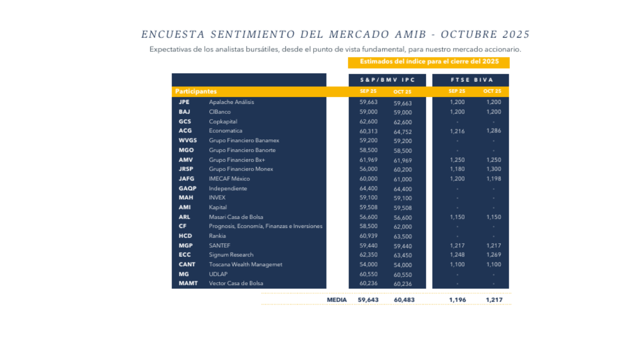 La Asociación Mexicana de Instituciones Bursátiles (AMIB) publicó su Encuesta de Sentimiento del Mercado – Octubre 2025, en la que analistas bursátiles nacionales compartieron sus expectativas para el cierre de año del S&P/BMV IPC y del FTSE BIVA, basadas en criterios fundamentales.