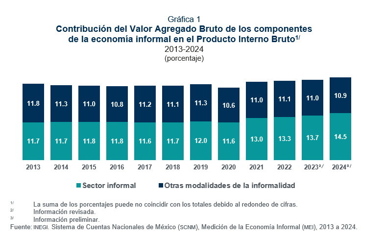 En 2024, la economía informal participó con 25.4 % del pib nacional en valores corrientes, en 2023 contribuyó con 24.7 %, lo que representó un aumento de 0.7 puntos porcentuales, informó el INEGI, que presentó los resultados preliminares de la Medición de la Economía Informal (mei) 2024 (con año base 2018).