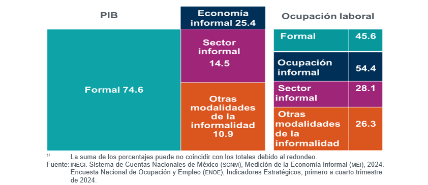 En 2024, la contribución del pib informal (25.4 %) la generó la población ocupada en condiciones de informalidad (54.4 %). El sector formal aportó 74.6 % del pib. Este porcentaje provino de la población ocupada formal (45.6 %). En otras palabras, por cada 100 pesos del pib del país, las y los ocupados formales generaron 75 pesos y quienes están en la informalidad, 25 pesos (ver cuadro 1).