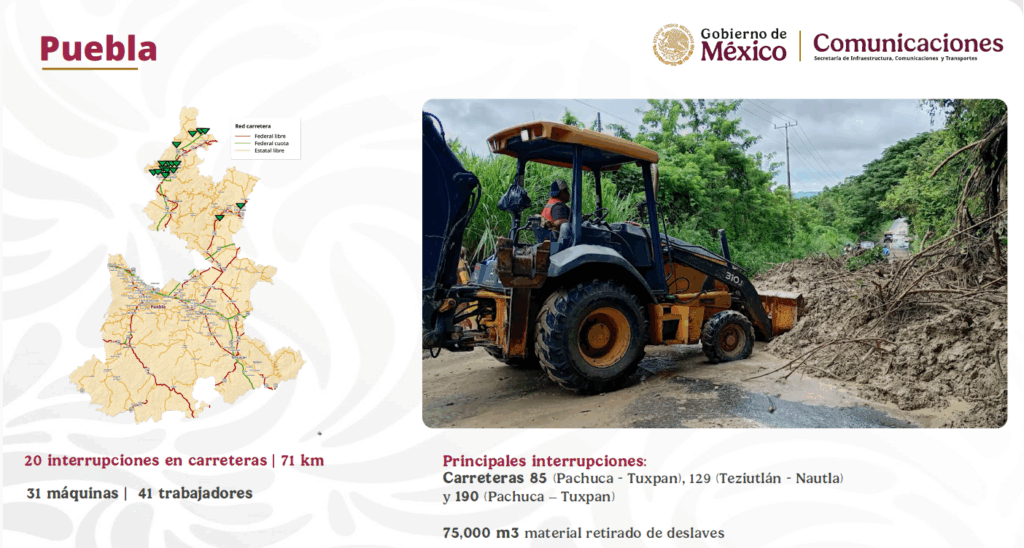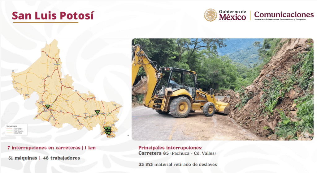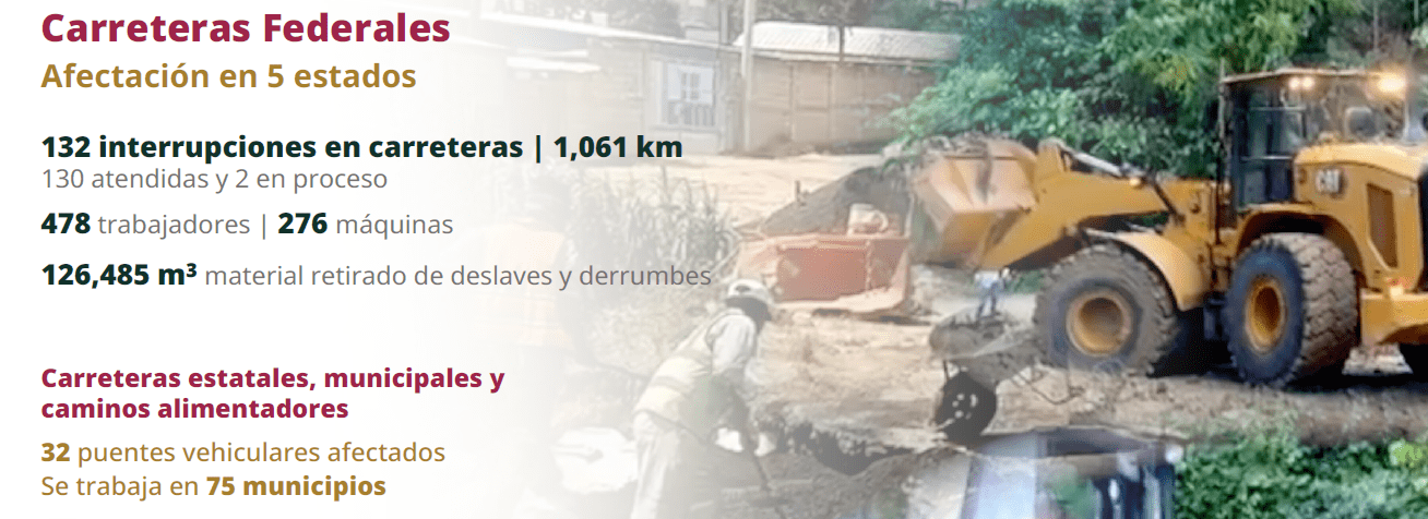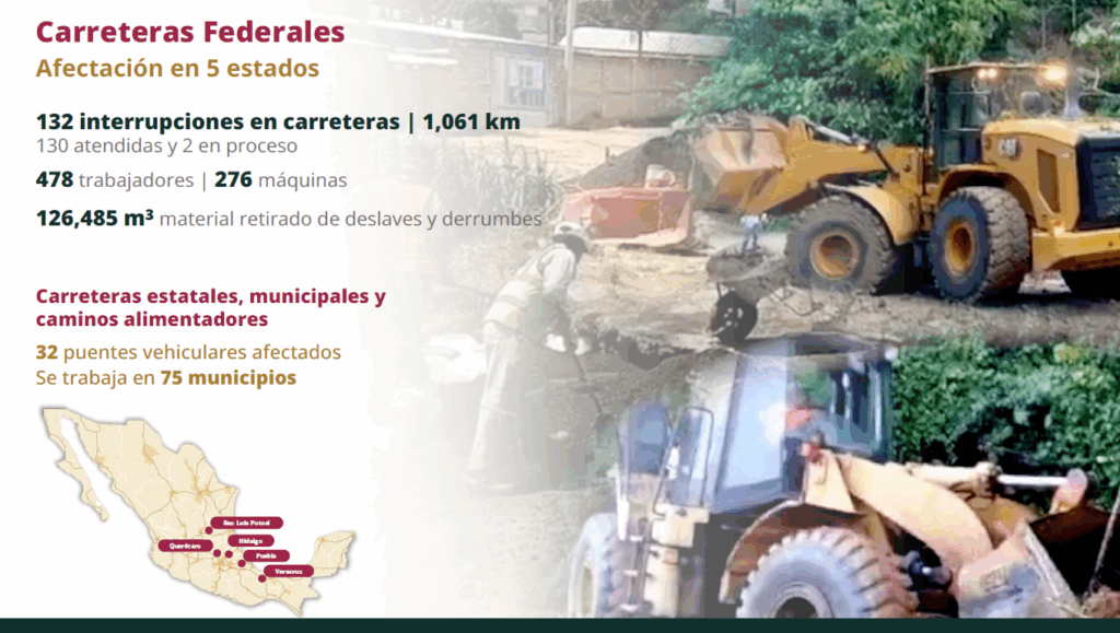 Por instrucciones de la Presidenta de México, Claudia Sheinbaum Pardo, se intensificaron las labores tanto en la Red Carretera Federal como en caminos estatales y rurales afectados.