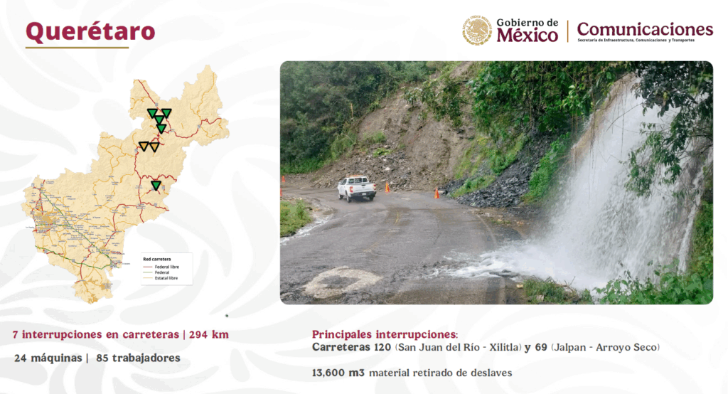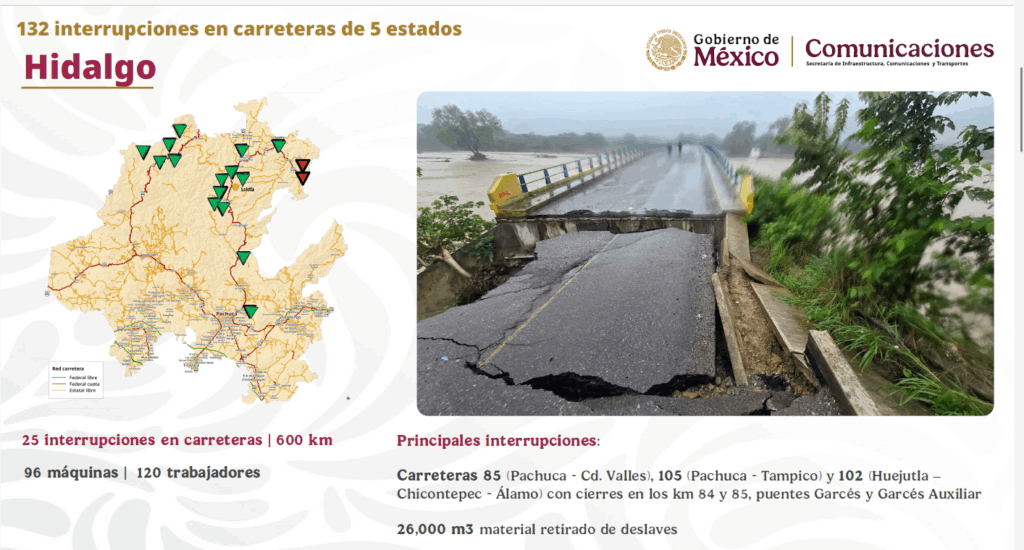 La Secretaría de Infraestructura, Comunicaciones y Transportes (SICT) del Gobierno de México reporta que, ante las intensas lluvias registradas en los últimos días en los estados de Hidalgo, Puebla, San Luis Potosí, Querétaro y Veracruz se registraron 132 interrupciones en la Red Carretera Federal de las cuales 130 ya fueron atendidas y dos están en proceso.
