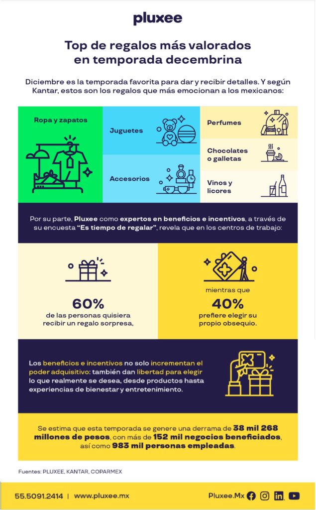 Por su parte, Pluxee, especialista en beneficios e incentivos, señala a través de su encuesta “Es tiempo de regalar” que en los centros de trabajo existe una clara tendencia hacia la personalización de los obsequios. Al menos 60% de los encuestados manifestó que le gustaría recibir un regalo sorpresa, mientras que 40% prefiere tener la libertad de elegir su propio obsequio.
