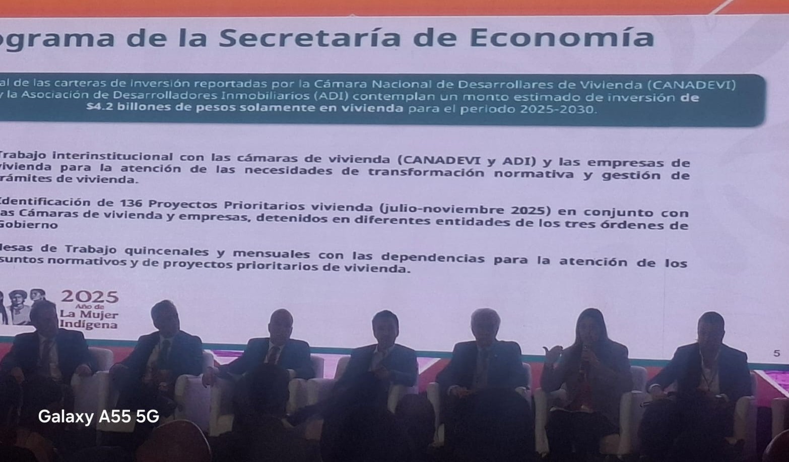 Señaló que la secretaría tiene identificada una cartera de inversión reportada por Cámara Nacional de la Industria de Desarrollo y Promoción de Vivienda (Canadevi) y por la Asociación de Desarrolladores Inmobiliarios (ADI) que contemplan “un monto estimado de inversión de 4.2 billones de pesos solamente en vivienda para el periodo 2025-2030”.