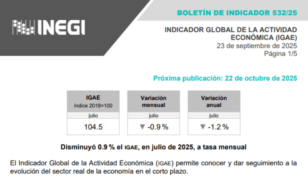 La economía mexicana volvió a mostrar debilidad en julio. El Indicador Global de la Actividad Económica (IGAE) registró una contracción mensual de 0.89%, por debajo de...