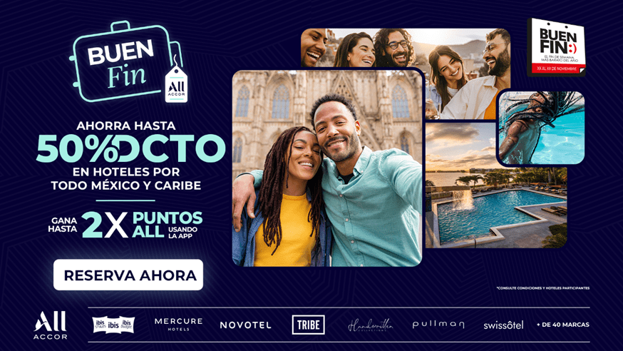 Accor, uno de los grupos hoteleros líderes a nivel global, anunció su participación en el Buen Fin 2025 con una campaña que ofrecerá hasta 50% de descuento en reservas realizadas del 13 al 17 de noviembre a través de ALL.Accor.com y la app ALL Accor. Las estancias podrán disfrutarse entre el 3 de diciembre de 2025 y el 31 de mayo de 2026.